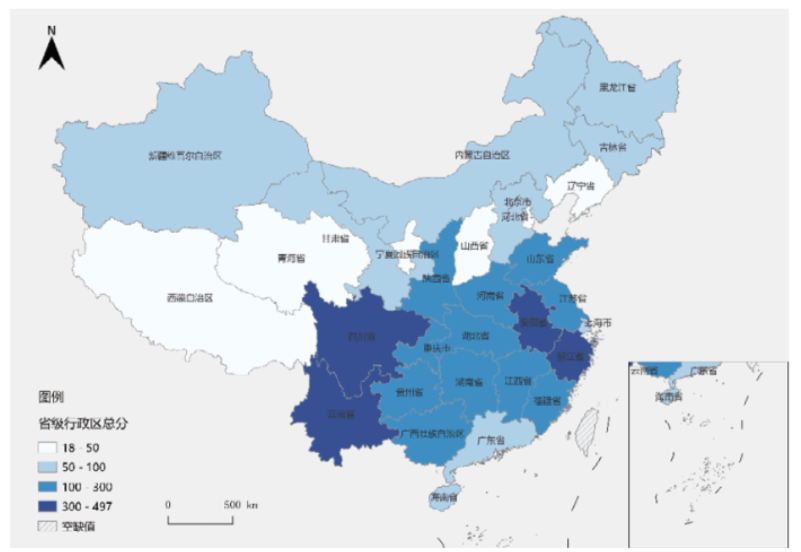 - 乡村数字治理指数得分在各省之间存在较大差距,四川、安徽、浙江、云南4省组成第一梯队,在乡村数字治理技术与实践方面处于引领位置,后发地区在这一治理创新领域展现出独特探索。